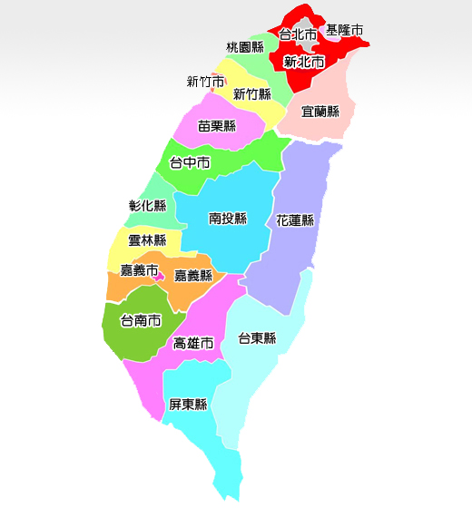 台北市 基隆 桃園 苗栗 宜蘭 彰化 南投 花蓮縣 雲林 台東縣 屏東縣 新北市 新竹 台中 嘉義 台南 高雄